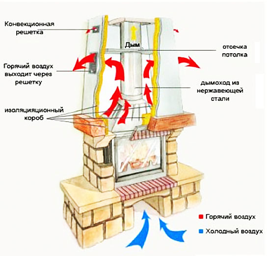 Фальшпотолок из волоконного полотна прикрепляют поверх двух ранее установленных слоев при помощи клея и полоски алюминиевой фольги или специальной клейкой ленты. Все швы необходимо проверить и промазать. После того как клей внутри просохнет, вырезанную переднюю панель, к которой уже приклеена волоконная плита, «сажают» на клей. Изолирующий слой должен войти по размеру. Кстати, пока высыхает клей и гипс, можно на уровне фальшпотолка вырезать отверстия для вентиляционных решеток. Короб решеток промазывают клеем и вставляют в образовавшееся отверстия. Остаток клея в верхней части внутренней изоляции усилит шов и позволит избежать его растрескивания. После того как клей просохнет, можно вставить декоративные решетки. Дымовой дефлектор, установленный внутри топки, позволяет регулировать теплообмен и скапливание сажи.